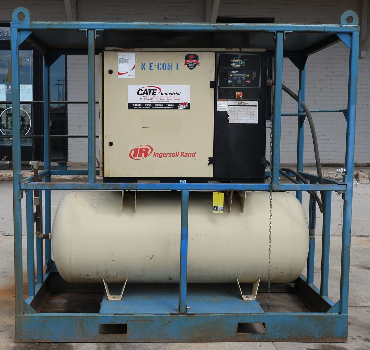 This compressor is inside of a steel cage that can be moved by a forklift or crane. It was used as a mobile compressor at jobsites previously. With 15,235 running hours and 7,743 load hours, it has been serviced and cleaned and is ready to go!